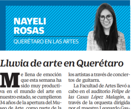 Lluvia de arte en Querétaro 17 febrero, 2025 / Fecha de publicación:Sábado 24 de septiembre de 2022Autor: Nayeli Rosas Ver PDF Link