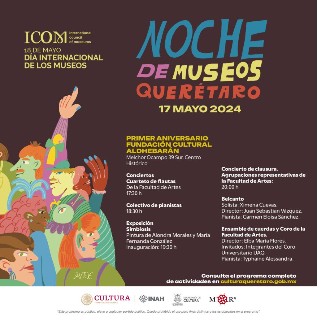 Artículos Inauguración de la Fundación Cultural Aldhebarán20 de mayo de 2023 Ver más Ver más Primer concierto Lumiére y Homenaje al maestro Arturo Pérez 31 de agosto de 2023 Ver más Noche de Museos17 de mayo 2024 Ver más Bolivia en Querétaro25 de mayo 2024 Ver más Tradiciones, cultura de Bolivia y grabado en la Facultad de Artes 27de julio 2024 Ver más Inaugura Artes UAQ la expo “Azul Profundo”, en honor a Anna Atkins21 de septiembre 2024 Ver más